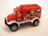 Red, white interior & chassis, smoke windows, "Matchbox Support Team 28", ringed flower - white hubs, bright blue T MB989 base |