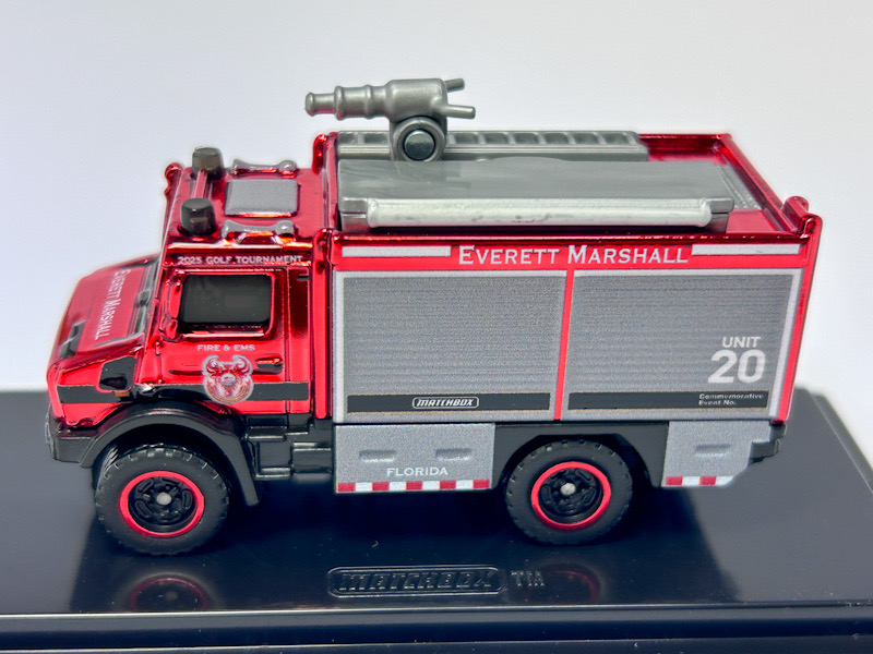 Chrome red, smoke windows, black interior, gray roof area, "Everett Marshall Unit 20", rubber tires - red rims, black T base (US Promo in plexi box) |
