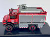 Red, blue windows, white interior, gray roof area, "Feuerwehr" & gray side panels, rubber tires - red rims, gray T base (Mattel Creations) |