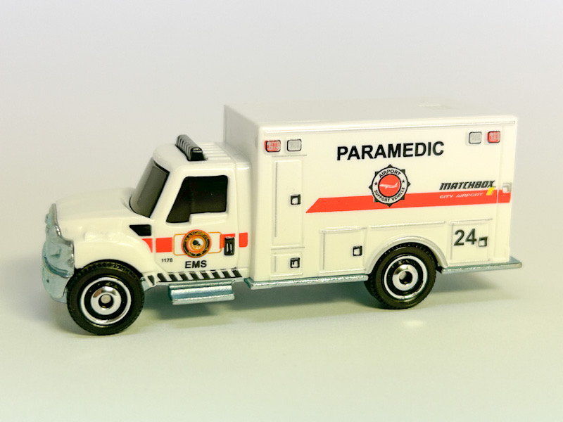 White plastic body, black windows, "Paramedic 24", ringed disc, unpainted T base |