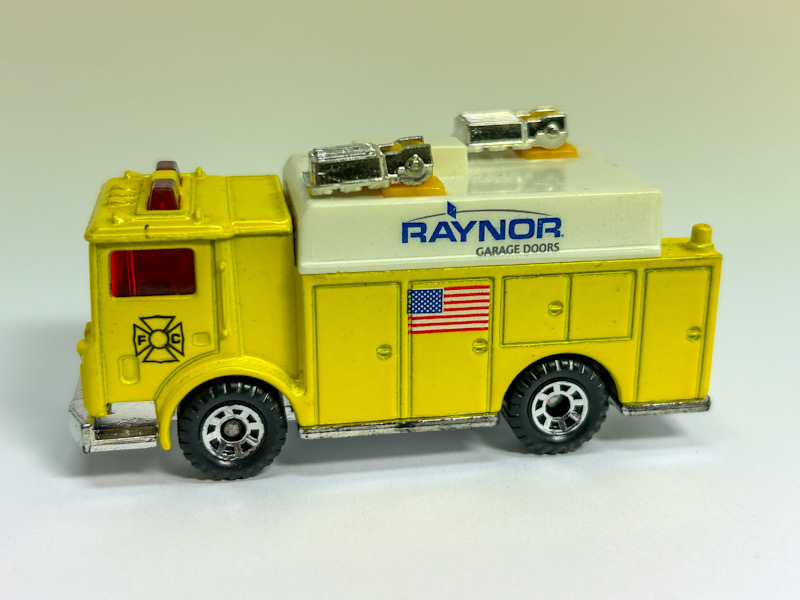 Yellow, chrome C base, red windows, 8 spoke wheels, white roof, chrome & yellow roof units, "Raynor Garage Doors" & American flag |