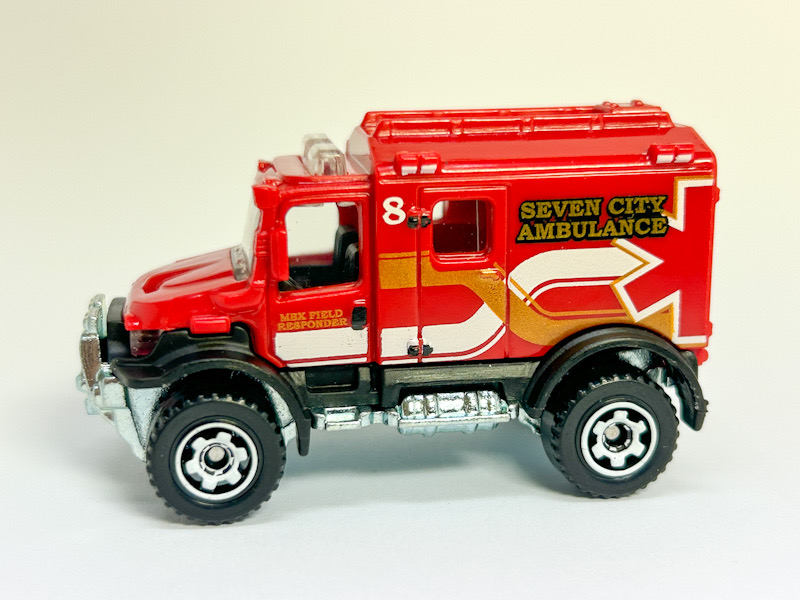 Dark red, black interior & chassis, clear windows, "Seven City Ambulance", ringed flower - white hubs, unpainted T MB989 base (Marine Rescue 5 Pack)