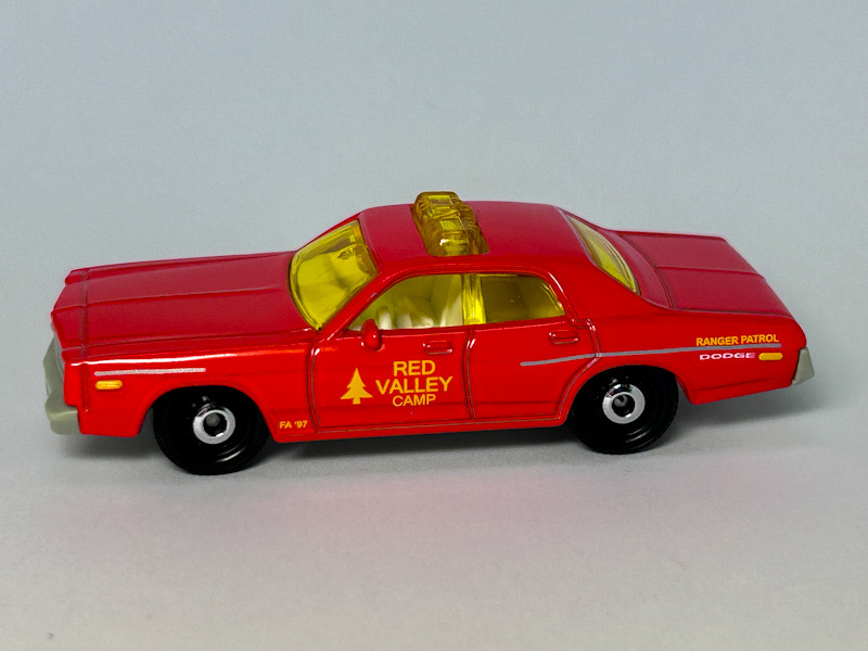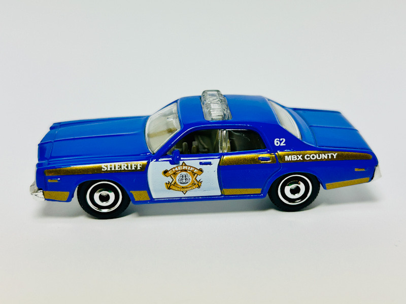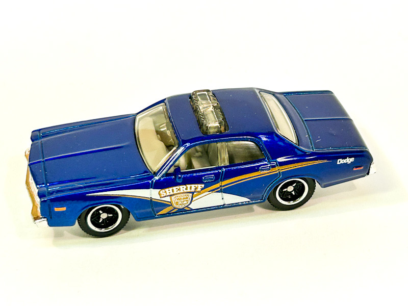 Bright blue, smoke windows, gray interior, "Sheriff", cut tri spoke, chrome T base (Walmart Dodge Series) |