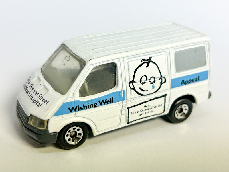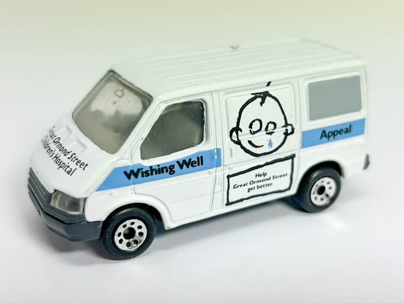 White, dark gray C base (rounded), gray interior, right hand drive, "Wishing Well Appeal" on sides, "Ambulance" on rear, with light blue stripe, "TRANSIT" license plate |